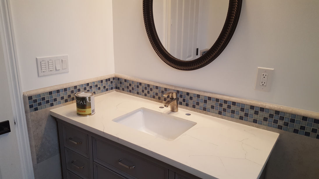 Out with the old, in with the new! Standard bathroom remodel with updated vanity, shower, floors and overhead light/heat/fan unit. Added soap boxes to shower and multiple towel bars per the clients request.